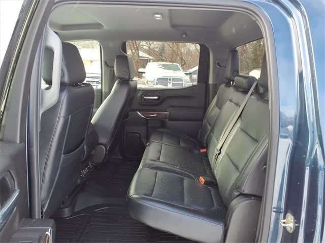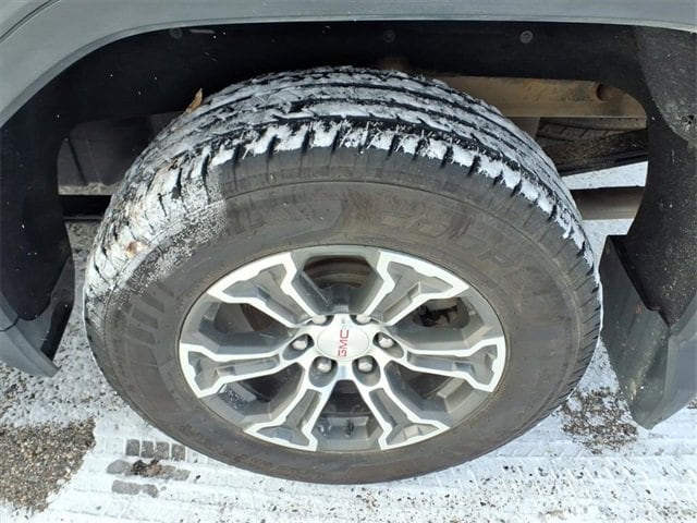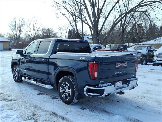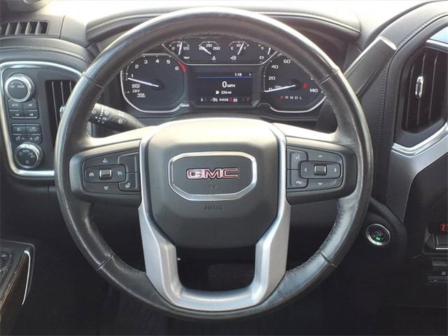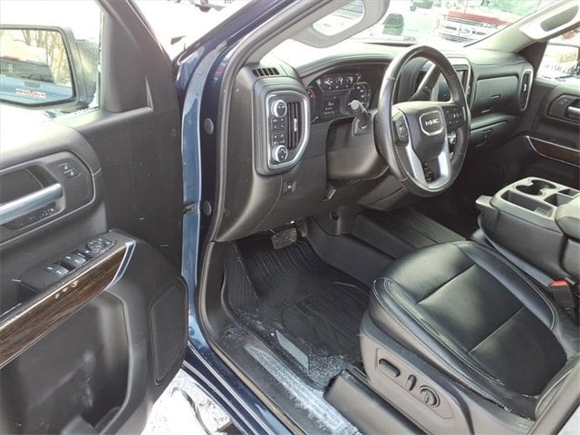 THE 2021 GMC SIERRA 1500 SLE CREW CAB FEATURES A JET BLACK INTERIOR WITH HEATED FRONT SEATS, A 10-WAY POWER DRIVER SEAT, DUAL-ZONE CLIMATE CONTROL, REAR HVAC VENTS, A HEATED LEATHER-WRAPPED STEERING WHEEL, AND KEYLESS OPEN/REMOTE START FOR ADDED CONVENIENCE. POWER COMES FROM THE 5.3L ECOTEC3 V8 PAIRED WITH AN 8-SPEED AUTOMATIC, BACKED BY THE X31 OFF-ROAD PACKAGE THAT ADDS OFF-ROAD SUSPENSION, A 2-SPEED AUTOTRAC TRANSFER CASE, SKID PLATES, HILL DESCENT CONTROL, INTEGRATED DUAL EXHAUST, AND ALL-TERRAIN TIRES. EXTERIOR FEATURES INCLUDE LED HEADLAMPS AND TAILLAMPS, THE MULTIPRO TAILGATE, 18 MACHINED ALUMINUM WHEELS, CORNERSTEP BUMPER, REAR WHEELHOUSE LINERS, POWER HEATED MIRRORS, AND A SPRAY-IN PROTECTION PACKAGE WITH SPLASH GUARDS AND ALL-WEATHER LINERS.