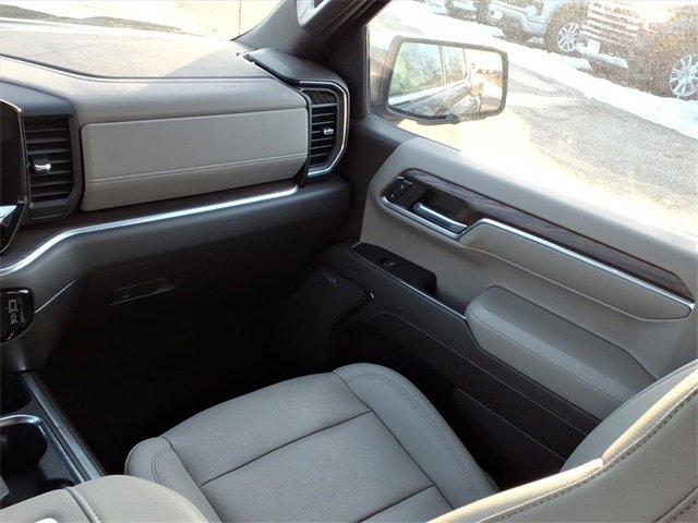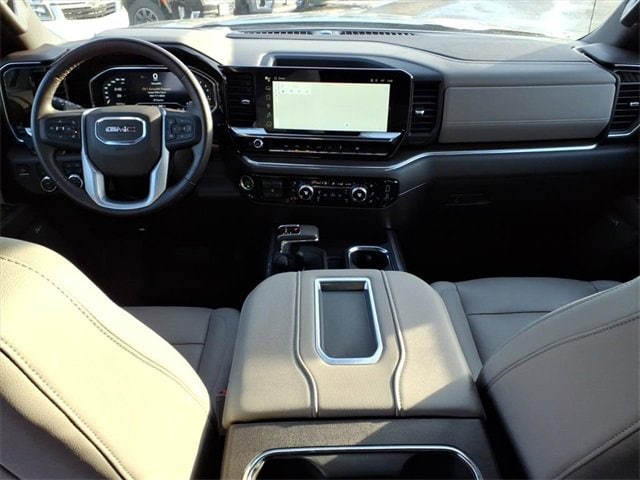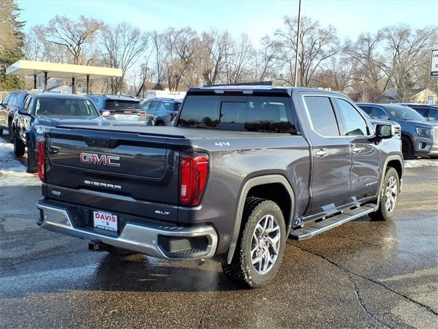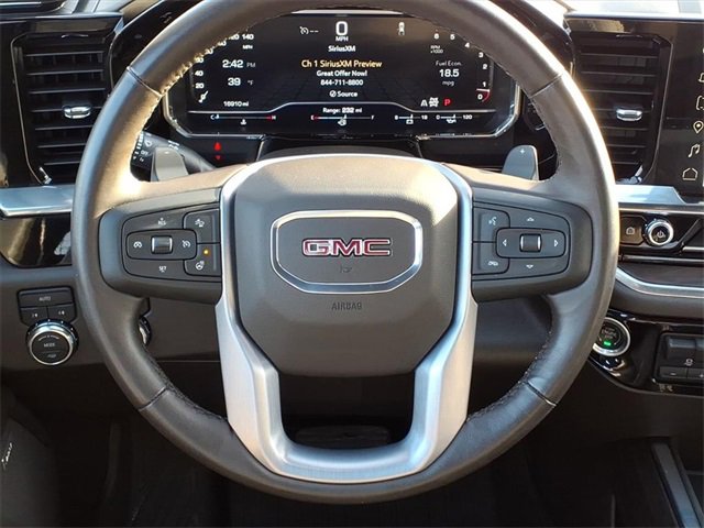 THE 2022 GMC SIERRA 1500 SLT FEATURES A WELL-EQUIPPED INTERIOR WITH HEATED FRONT AND REAR SEATS, HEATED LEATHER-WRAPPED STEERING WHEEL, DUAL ZONE CLIMATE CONTROL, DRIVER SEAT AND MIRROR MEMORY, POWER BUCKET SEATS, WIRELESS CHARGING, BOSE PREMIUM AUDIO, AND A 13.4 TOUCHSCREEN WITH GOOGLE BUILT-IN, WIRELESS APPLE CARPLAY AND ANDROID AUTO. PERFORMANCE AND CAPABILITY HIGHLIGHTS INCLUDE THE 5.3L ECOTEC3 V8 ENGINE, 10-SPEED AUTOMATIC TRANSMISSION, 4WD WITH AUTOTRAC TRANSFER CASE, TRAILERING PACKAGE WITH TRAILER BRAKE CONTROLLER, ADAPTIVE CRUISE CONTROL, AND IN-VEHICLE TRAILERING APP. EXTERIOR AND SAFETY FEATURES INCLUDE GMC MULTIPRO TAILGATE, 20 POLISHED ALUMINUM WHEELS, SPRAY-IN BEDLINER, LED LIGHTING, POWER FOLDING HEATED MIRRORS, HD SURROUND VISION, REAR CROSS TRAFFIC BRAKING, LANE KEEP ASSIST, AND AUTOMATIC EMERGENCY BRAKING.