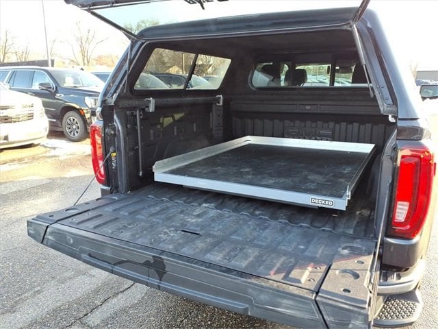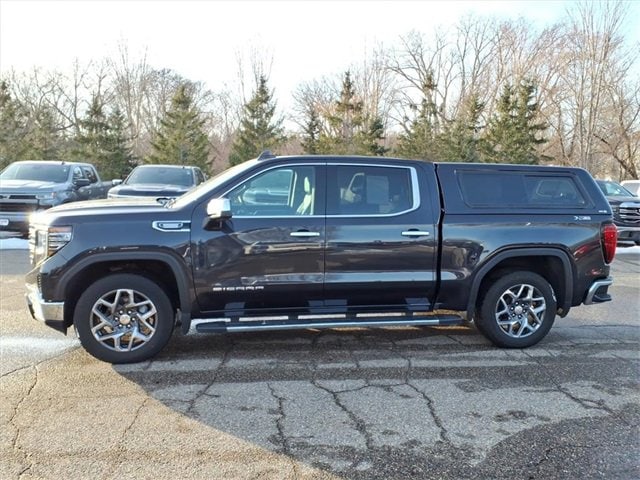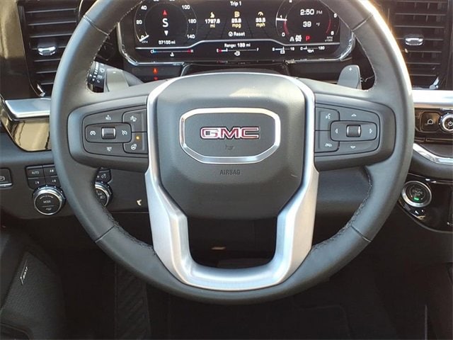 THE 2023 GMC SIERRA 1500 SLT FEATURES A PREMIUM INTERIOR WITH HEATED FRONT SEATS, HEATED LEATHER-WRAPPED STEERING WHEEL, DUAL ZONE CLIMATE CONTROL, DRIVER SEAT AND MIRROR MEMORY, POWER BUCKET SEATS, BOSE PREMIUM AUDIO, AND A 13.4 TOUCHSCREEN WITH GOOGLE BUILT-IN, WIRELESS APPLE CARPLAY AND ANDROID AUTO. PERFORMANCE AND CAPABILITY HIGHLIGHTS INCLUDE THE DURAMAX 3.0L TURBO-DIESEL ENGINE, 10-SPEED AUTOMATIC TRANSMISSION, 4WD WITH 2-SPEED AUTOTRAC TRANSFER CASE, X31 OFF-ROAD PACKAGE, TRAILERING PACKAGE WITH TRAILER BRAKE CONTROLLER, AND ADAPTIVE CRUISE CONTROL. EXTERIOR AND SAFETY FEATURES INCLUDE THE GMC MULTIPRO TAILGATE, POWER SUNROOF, 20 POLISHED ALUMINUM WHEELS, SPRAY-IN BEDLINER, HD SURROUND VISION, TRAILER SIDE BLIND ZONE ALERT, REAR CROSS TRAFFIC BRAKING, AND GMC PRO SAFETY WITH AUTOMATIC EMERGENCY BRAKING.