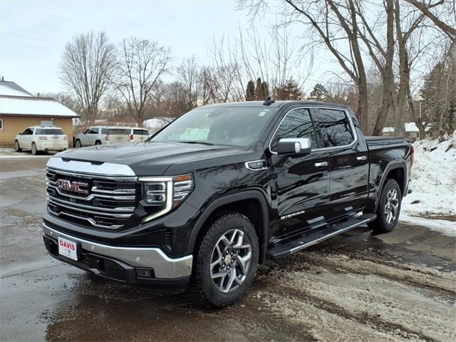 THE 2024 GMC SIERRA 1500 SLT CREW CAB 4X4 FEATURES A PREMIUM INTERIOR WITH HEATED AND VENTILATED FRONT BUCKET SEATS, HEATED STEERING WHEEL, MEMORY SEAT SETTINGS, DUAL-ZONE CLIMATE CONTROL, WIRELESS CHARGING, BOSE AUDIO, POWER RAKE/TELESCOPING STEERING COLUMN, AND A POWER SLIDING REAR WINDOW. ADVANCED TECH INCLUDES A 13.4 GOOGLE BUILT-IN TOUCHSCREEN, 12.3 DIGITAL DRIVER DISPLAY, ADAPTIVE CRUISE CONTROL, HD SURROUND VISION, TRAILER CAMERA PROVISIONS, TRAILER BRAKE CONTROLLER, SAFETY ALERT SEAT, AND FULL GMC PRO SAFETY WITH AEB, LANE KEEP ASSIST, REAR CROSS-TRAFFIC BRAKING, AND REAR PEDESTRIAN ALERT. THE EXTERIOR ADDS THE X31 OFF-ROAD PACKAGE WITH SKID PLATES, OFF-ROAD SUSPENSION, HILL DESCENT CONTROL, 20 POLISHED ALUMINUM WHEELS, MULTIPRO TAILGATE, CHROME ASSIST STEPS, SPRAY-ON BEDLINER, LED LIGHTING, POWER FOLDING HEATED MIRRORS, AND THE 5.3L ECOTEC3 V8 PAIRED TO A 10-SPEED AUTOMATIC.